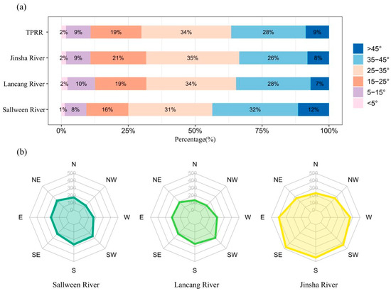 Slopes greater than 25° account for 75% of the total area of the DVT (Figure 6a). The distribution of dry valley slopes in each basin is consistent, with steep slopes and sharp slopes dominating the area. Among them, the DVS has the smallest distribution area of flat slopes and the largest distribution area of sharp and dangerous slopes, which shows that the DVS has the most treacherous terrain.