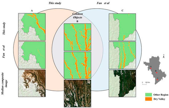 Subfigures (A–C) shows the similarities and differences between our results and those of Fan et al. [50]: The left column (A) shows the dry valley in the upper Sallween River region identified in our study that is only sparsely distributed in the results of Fan et al. The right column (C) shows the dry valley identified by Fan et al. in the middle–lower reaches of the Sallween, Lancang, and Jinsha Rivers that is considered to exist only in the Yingpan section of the Lancang River in Lamping in our study. The center column (B) shows the region around 29° north latitude in the TPRR, where the dry valley appears in both research works.