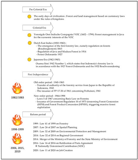After Indonesia proclaimed its independence on 17 August 1945, the responsibility of forest management shifted from the Dutch and Japanese to the Indonesian government. The government began to organize legal arrangements for forest management to adapt to the conditions of Indonesia as an independent country. The adaptation was carried out by translating the forestry laws produced during the colonial period to conform with the Preamble of the 1945 Constitution. In addition to this, work guidelines were also prepared by the Forestry Service to outline Indonesian government policies regarding forest management. However, forest management laws were still in the form of forestry laws and regulations inherited from the Dutch colonial government [9,10].