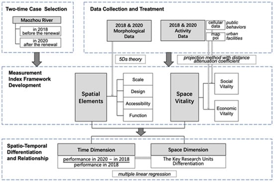 However, although these tools and data help in exploring how the improvement of built environments influences space vitality, few studies focus on a waterfront renewal process by tracking data and measuring changes in its spatial elements and space vitality. This might be due to the limitation of data accuracy on the spatial scale and the difficulty of acquiring data in the available time span [26]. Therefore, we take a spatio-temporal differentiation perspective and track two-time datasets for corresponding periods before and after the waterfront renewal to measure changes in the spatial elements and vitality separately. Further, we apply multiple linear regressions to analyze the corresponding relationships to determine the most influential spatial elements for improving waterfront space vitality.
