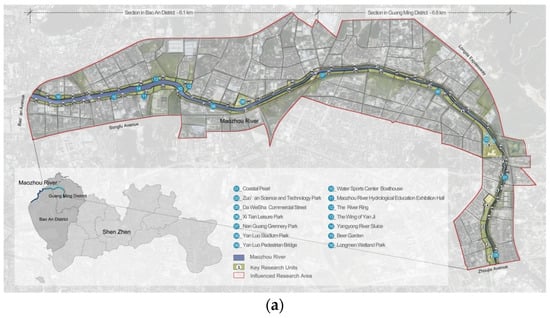 The Maozhou River project in Shenzhen, constructed from 2019 to 2020, is an early project of the “Ten-thousand km Garden-Way” program proposed by the Guangdong government [46,47,48,49]. By selecting this project—a recent representative renewal case in China, converting black and odorous rivers into a quality public space—our study provides guidance for future waterfront renewal projects. This study focuses on the project’s major design of shoreline public spaces, the so-called key research units, 61 in total, which are spread inland 50~10 m from the water border over a 1.3 km2 area. Furthermore, to monitor the influenced vitality of the waterfront renewal, we delineated an influenced research area, which was 500~1000 m inland from the water border based on the concept of building a 15 min neighborhood, covering a 15.8 km2 area (Figure 2).