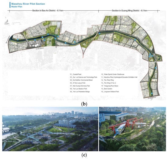 Research case information. (a) Research case scope, (b) The masterplan of the Maozhou River renewal project (cited from Tongji Architectural Design (Group) Co., Ltd.), (c) The images of the typical node spaces of the project, Left Bank Park (cited from reference [47]) and Longmen Wetland Park (cited from reference [48]).