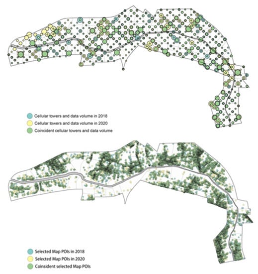 Based on the spatial element and space vitality frameworks, we collected the same categories of morphological and activity data for corresponding periods in 2018 and 2020. Morphological data were collected from remote sensing images, which were combined with on-site survey maps and project design documents. Data from public sites, such as the Shenzhen Statistic Bureau website, were used as supplements. Thus, we obtained morphological data (i.e., shape, size, and function) of basic sites including road networks and land boundaries as well as major—planned or built—public spaces. For activity data, we collected two kinds of data, respectively, in October 2018 and October 2020, which are cellular data from a selected communication operator and POIs on maps. We used monthly spatio-temporal cellular data, statistically overlaid with the instantaneous data from each cell tower, which effectively helps avoid some daily accidental errors. It is worth noting that between 2018 and 2020, during the waterfront regeneration, 24 new cell towers had been installed. After manually deleting these towers, 443 effective cell phone signal towers in the influenced research area remained, each with a precision range of 200 to 500 m. In total, 829,539 and 766,388 pieces of cellular data were collected in 2018 and 2020, respectively, including anonymous user IDs of encrypted mobile phones, timestamps, cell tower geographical coordinates, stay length, and stay type. In collecting POI data, we first applied web service access keys and then obtained POI data from maps in October 2018 and October 2020 using Python. Overall, 10,772 and 10,244 pieces of POI data of the influenced research area were selected in 2018 and 2020, respectively (Figure 3).