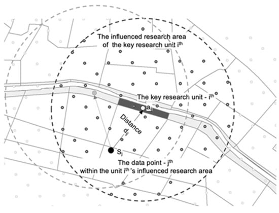 From previous research on waterfront public space and waterfront inland, we found that the domain is generally divided into 2 or 3 research belts by a pedestrian shed of 5, 10, and 15 min [7,17]. Because this stepped segmentation method assigns the same vitality and space characteristics to a belt, it disregards the revival of regional vitality brought by public space renewal, which changes continuously with distance. Instead of simply combing the activity data within the pedestrian shed, we considered the distance attenuation when converting the data from the influenced research area to the key unit. A gravity model was initially proposed to reflect the retail gravitation on its neighborhood [53], interpreting that the potential attraction between spaces was negatively related to distance. Gradually, this has been widely recognized and applied in urban geography studies and urban planning such as infrastructure accessibility [54] and origin–destination flows [55]. In these studies, the law of distance attenuation is constantly confirmed, and the attenuation curve is gradually fitted with the power function. Therefore, considering the regional vitality impact of the waterfront renewal, we introduced this distance attenuation coefficient from the gravity model, so that the impact represented by the activity data can decrease exponentially with distance in the influenced research area (Figure 4). The equations are as follows:
