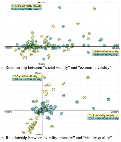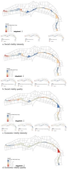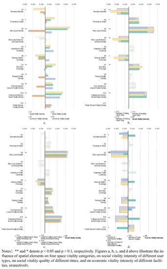 Moreover, for each spatial element in the 15 models, no multicollinearity with a variance inflation factor higher than 6 was found. Moreover, all spatial elements in a certain model displayed some correlations with p values less than 0.1 or even 0.05. Specifically, for the nine models on social vitality, X5, X8, and X11 barely showed an influence relationship with p values more than 0.1, and for the other six models on economic vitality, neither did X2, X4, and X7.