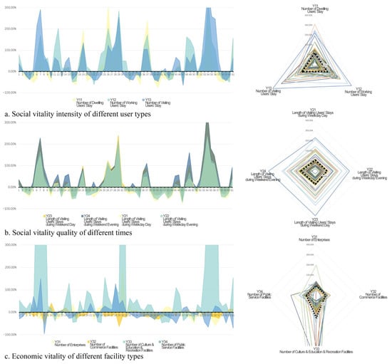 The four space vitality categories increased significantly from 2018 (before the renewal) to 2020 (after the renewal; Figure 5). Social vitality intensity and quality, and economic vitality intensity and quality increased by 28.09%, 16.98%, 27.24%, and 3.53%, respectively. As suggested by the change in the “society vitality” and “economic vitality” relationship (Figure 6a), the research units’ values were generally distributed alongside the x-axis, with a few diverging toward the y-axis, suggesting that social vitality changed more than economic vitality. Although the economic activities in most units became increasingly diverse, the change was gradual, and no large-scale growth appeared. As shown by the change in the “vitality intensity” and “vitality quality” relationship (Figure 6b), more data fell into the first and third quadrants. Data in the first quadrant significantly diverged, indicating that the vitality of some units surged. Regarding the stay length and population of different user types at different times (Figure 7a,b), visitors were more prevalent than dwellers or workers, and visitors stayed much longer in the daytime and weekend evenings than on workdays. Notably, economic vitality, as represented by the number of POIs of the four categories, dropped from 2018 to 2020 (Figure 7c). The number of enterprises and commercial services decreased but the number of cultural, educational, and recreational facilities (exhibition venues and parks) increased by 123.41%, on average.