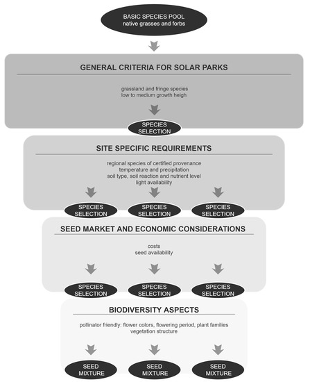 The general criteria for solar parks are applied to a pool of native grasses and forbs. In this step, two criteria are used to filter out a selection of species that are generally suitable for grasslands in solar parks. In general, species covering a wide range of grassland communities can be used. Due to the extensive vegetation management usually implemented in solar parks [23], as well as the partially lower light availability [48,49], species of fringe communities should also be used. In order to ensure year-round maintenance of the technical systems and avoid shading the panels, which could reduce the energy yield, the growth height of the species used must not be higher than the lower edge of the panels [50]. As the lower edge is usually about 80 cm high, only low- to medium-growth-height species should be included in mixtures for solar parks.