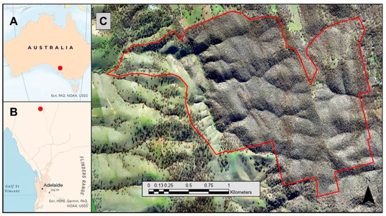 Location of the study area within Australia, (A) within South Australia, (B) and its surroundings. (C) Red outline indicating the boundary of Spring Gully Conservation Park.