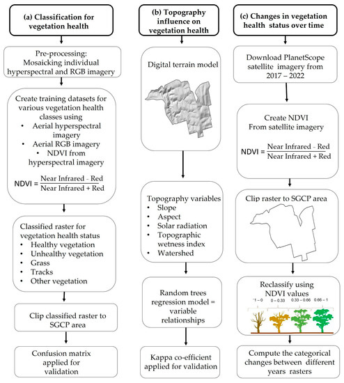 We used satellite and aerial imagery to assess vegetation health and explore dieback within the SGCP. This integrated remote sensing approach is illustrated in Figure 2 and was used to identify vegetation health status in 2022, determine the influence of topography on vegetation health status and identify vegetation health changes over time.