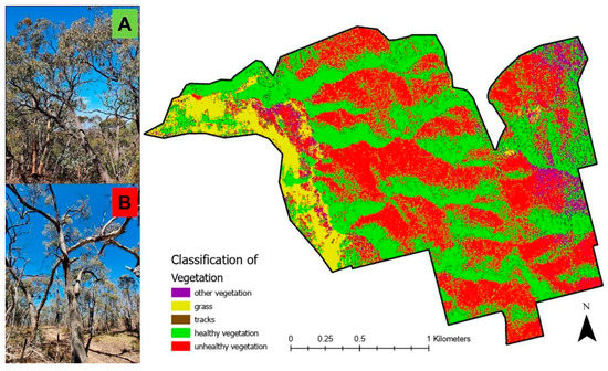 Classified vegetation health status map using 2022 aerial hyperspectral imagery at 50 cm resolution of the SGCP. Images (A,B) provide an indication of how the healthy (47%) and unhealthy (37%) vegetation classes would look on the ground, respectively.