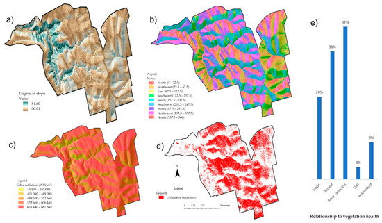 Digital terrain model (DTM) created June 2022 (a) Computed degree of the slope with the green area indicating a greater degree of slope. (b) Computed aspect image highlighting northwest-facing slopes in pink. (c) A computed solar radiation image indicates red areas exposed to high solar radiation levels from January to April 2022. (d) Unhealthy vegetation classified image showing the relationship with topography variables. (e) The relationship of variables with vegetation health was identified through a random regression model in ArcGIS Pro, indicating that solar radiation at 37% and aspect at 31% had the highest correlation with vegetation health.