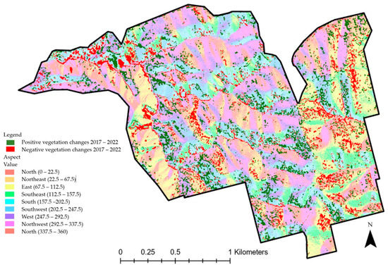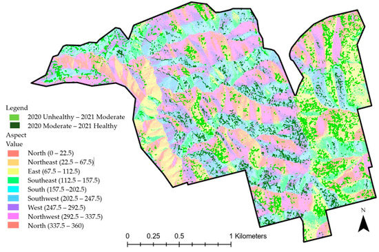Overall, positive changes in vegetation health categories (see Table S3) occurred in a positive direction for 9.5% (0.39 km2) of the area, mainly on the south-to-southwest downward-facing slopes. The percentage of priori health categories that shifted in a negative direction was 7% (0.29 km2), occurring across the whole SGCP, not just isolated to certain areas or small pockets (Figure 5). The main regions of negative category change occurred along the east-to-northeast downward-facing slopes. The remaining 83% (3.43 km2) of SGCP stayed within the same health category from 2017–2022, although it is likely that change within categories also occurred.