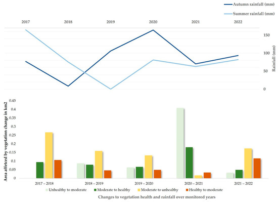 Changes in vegetation health in relation to seasonal rainfall. Changes from one vegetation health category to another, area of SGCP affected in km2 between 2017–2018, 2018–2019, 2019–2020, 2020–2021 and 2021–2022 using PlanetScope satellite imagery. Rainfall (mm) amount occurring from December–February (summer) and March–May (autumn) for each year from 2017–2022. Note that the amount of rainfall is indicated between the interannual changes in vegetation health, i.e., the rainfall amounts for 2018 are shown between the 2017–2018 and 2018–2019 vegetation changes.