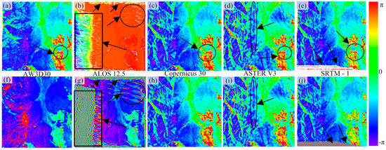 For the Qinghai-Tibet Plateau region, the interferograms and phase unwrapping results can be obtained with the assistance of five high-precision DEMs as shown in Figure 3. Figure 3a–e and Figure 3f–j present phase unwrapping results and interferograms respectively. Visually, the ALOS 12.5 and SRTM-1 assisted phase unwrapping results have significant errors in the region shown by the arrows. The former has a large area of striped cracks in mountain areas; the latter has extensive unwrapping null values in the lower right corner. AW3D30 assisted results still have partial null values in the downstream area of the river valley. Copernicus 30 assisted results have the best visual effect, basically restoring the direction of mountains, and increasing the details of the entire image, with only few null values appearing in the area indicated by the arrow. And The results of ASTER V3 assisted have a few null values at the circles and abnormal values at the mountain indicated by the ellipse.