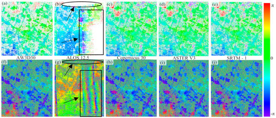 Figure 4 shows the results of five high-precision DEM assisted processing for the Central China Plain region respectively. Figure 4a–e and Figure 4f–j present phase unwrapping results and interferograms respectively. From the visual effect, the results of ALOS 12.5 assisted has significant errors in the area indicated by the arrow. The others have no obvious error areas.