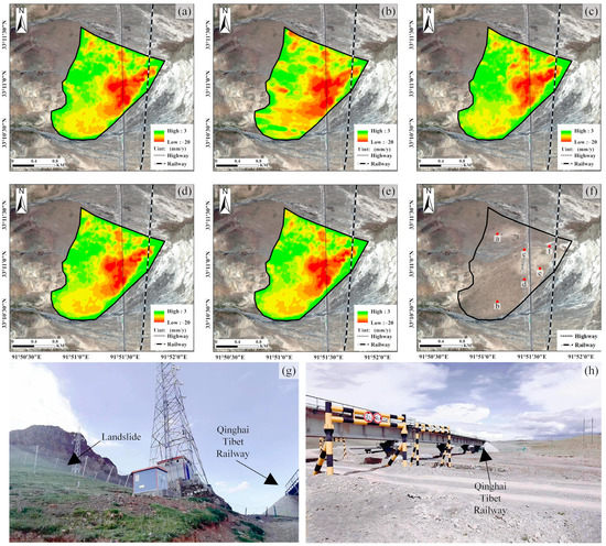 Figure 5 shows SBAS-InSAR deformation velocity diagrams of five high-precision DEM assisted, optical images, and on-site photos in the key focus areas of the Qinghai-Tibet Plateau. This area is located in frozen soil section and passes through G109 Expressway and K1238+270-K1237+800 section of Qinghai-Tibet Railway. As can be easily seen from Figure 5f–h, this section is located between two rivers, and There is a risk of landslides along railway bridges. From the visual effect, all five results have experienced significant large-scale deformation, almost spreading throughout the entire highway section and the central area of the railway section, with little difference in the red settlement range.