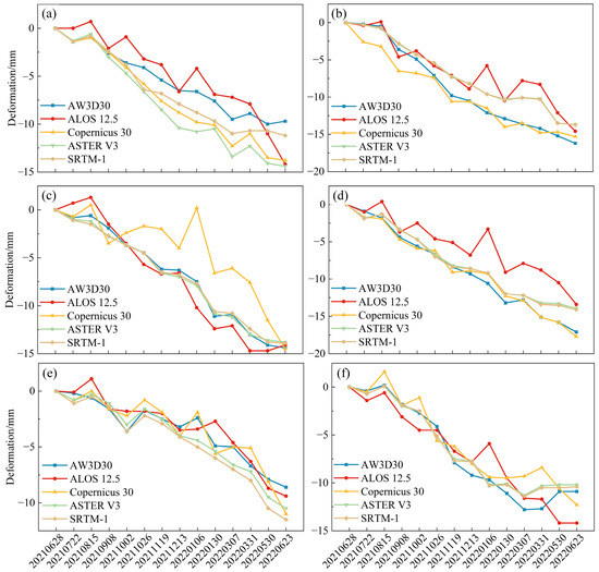 To further quantify the trend and fluctuation of the deformation points, the time series deformation curves of the six deformation points in the focus area are shown in Figure 6, with progressive settlement, the maximum deformation of −17.5 mm, and the minimum deformation of −12.5 mm. However, the ALOS 12.5 deformation curve at five of these six points has significant fluctuations, with a deviation of more than 5 mm from the other four results, and the deformation amount is relatively small compared to other results. The reason for this should be that the focus area is close to mountainous areas, while the phase unwrapping results of ALOS 12.5 in mountainous areas are not ideal, leading to deviation in the results. Therefore, in the flat areas of the Qinghai Tibet Plateau, we can obtain good results using the other four types of DEMs to assist in deformation monitoring.