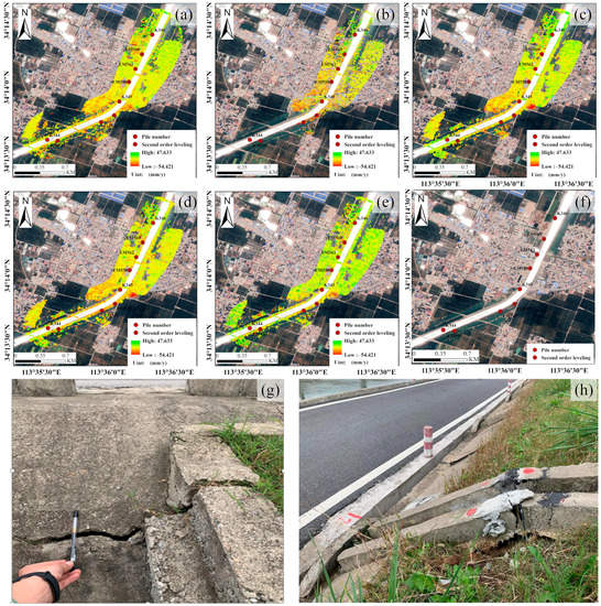 (a) deformation velocity diagram of AW3D30 key area, (b) deformation velocity diagram of ALOS 12.5 key area, (c) deformation velocity diagram of Copernicus 30 key area, (d) deformation velocity diagram of ASTER V3 key area (e) deformation velocity of SRTM-1 key area, and (f) satellite image of key area. (g,h) are site photos of the key area.