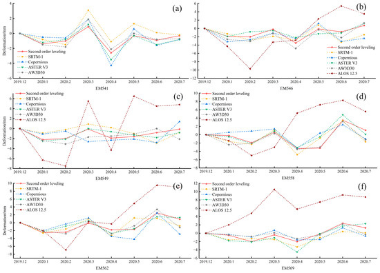 Time series analysis of typical characteristic points in key regions of the Central China Plain. (a) Deformation curves of five results for point EM541. (b) Deformation curves of five results for point EM546. (c) Deformation curves of five results for point EM549. (d) Deformation curves of five results for point EM558. (e) Deformation curves of five results for point EM562. (f) Deformation curves of five results for point EM569.