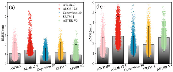 To avoid unreliable conclusions caused by the randomness of the selected deformation points, Figure 9 presents the root mean square error (RMSE) values of all deformation points in the key areas assisted by five types of DEMs for two landforms. The RMSE value is calculated based on the difference between the measured and simulated shape variables of different pixels. The smaller the value, the more accurate the observed value, and the black rectangle represents the average value of the data. In plateau areas, ALOS 12.5 < SRTM-1 < AW3D30 < ASTER V3 < Copernicus 30. In plain areas, from the perspective of accuracy, ALOS 12.5 < ASTER V3 < SRTM-1 < Copernicus 30 < AW3D30. This further confirms that Copernicus 30 is more suitable for plateau areas, and AW3D30 is more suitable for plain areas.
