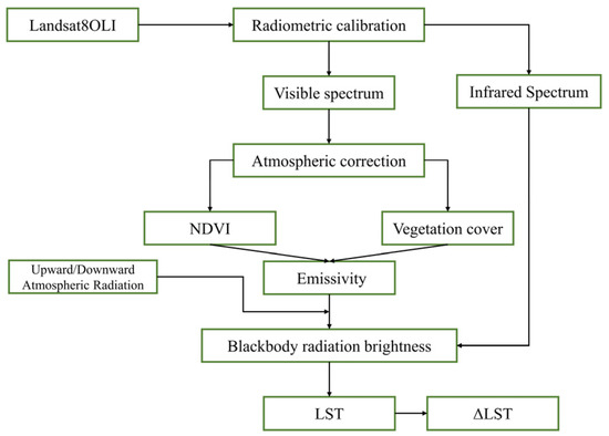 A DEM was generated using 30 m Shuttle radar mapping data from SRTM project images; elevation (ELE), slope, and aspect data were generated from this the Shuttle data using the ArcGIS10.7 software package. Temperature data were obtained from Landsat8OLI satellite images downloaded from the geospatial data cloud (https://www.gscloud.cn (accessed on 11 February 2023)); the annual average land surface temperature (LST) and seasonal land surface temperature difference (ΔLST) for the area of interest were determined by selecting 11 remote sensing images at 30 m resolution with low cloudiness. The LST data were obtained by inversion of the atmospheric correction method, which is performed in Figure 2.