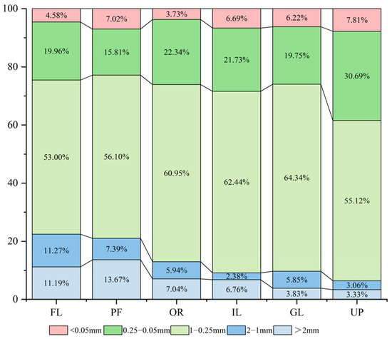 The 1~0.25 mm size fraction dominated, accounting for 58.66% of the total aggregate mass on average, followed by the 0.25~0.05 mm fraction (21.71% of the total aggregate mass). The <0.5 mm size fraction was least abundant overall, accounting for just 6.01% of the total aggregate mass. However, the 2–1 mm size fraction was least abundant in irrigated land and uplands, accounting for 2.38% and 3.06% of the total aggregate mass, respectively. Orchards had the lowest content of >2 mm aggregates (3.83% of the total aggregate mass; Figure 3). Macro-aggregates were more abundant in paddy and forest soils, while silt and clay were more abundant in uplands.
