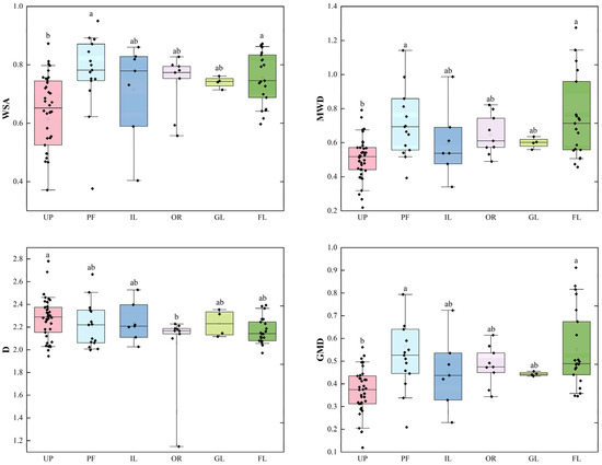 Soil aggregate properties. Multiple comparisons use the Tukey’ HSD test. Different letters indicate significant difference between land use types at p = 0.05 level. PF: paddy field; IL: irrigated land; FL: forest land; UP: upland; OR: orchard; GL: grassland.