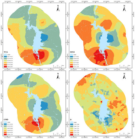 The spatial distributions of WSA, MWD, and GMD were all similar and indicate that the southern and western parts of the reservoir area have relatively high proportions of large soil aggregates and good soil stability whereas the central and northwestern parts have fewer macro-aggregates and worse soil stability. The values of D vary between 1.14 and 2.78 due to the low variance of the corresponding semivariance function. Together with the low spatial correlation distance of D, this meant that the distribution obtained for this index by Kriging interpolation was relatively fragmented. Overall, D was low in the reservoir area’s south-central and north-western regions but high in the central and eastern parts, exhibiting a negative spatial correlation with WSA, MWD, and GMD.