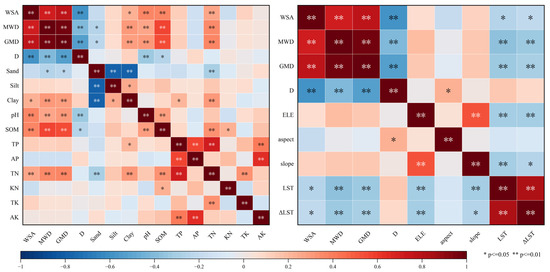 Pearson correlation analysis was used to obtain the correlation matrix for the soil aggregate stability indices and soil physicochemical properties (Figure 6). There were strong and significant positive correlations between WSA, MWD, and GMD, and all of them had significant negative correlations with D, in accordance with the Kriging interpolation results. Sand had significant negative correlations with MWD and GMD, while clay, pH, SOM, and TN had significant positive correlations with WSA, MWD, and GMD. Clay, pH, SOM, and TN also exhibited significant positive correlations with WSA, MWD, and GMD, while D was significantly and negatively correlated with pH, SOM, slope, and aspect. Finally, the temperature variables LST and ΔLST had significant negative correlations with WSA, MWD, and GMD. These results show that multiple soil physicochemical properties and environmental factors significantly affect soil aggregate stability.