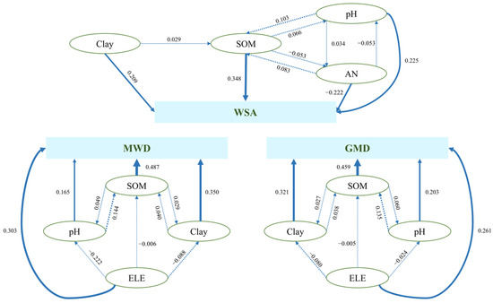 Path analysis was used to determine the direct and indirect effects of soil physicochemical properties on soil aggregate stability by using stepwise linear regression method in SPSS (Figure 7). The route analysis included WSA, MWD, and GMD, but no significant influential elements were found for D, so it was impossible to perform a path analysis for this index. Indicators with significant effects on WSA were SOM, AN, pH, and clay. The indirect effect of pH was substantial: 37.7% of its total impact on WSA resulted from indirect effects on SOM and AN. AN had a negative direct effect on WSA but also had a positive indirect effect via SOM and Clay. Indicators with significant effects on MWD and GMD included SOM, Clay, ELE, and pH. The latter two of these indicators had relatively strong indirect effects; ELE had a negative indirect effect on SOM via clay and pH as well as a strong positive direct effect on MWD and GMD. Conversely, pH had a positive indirect effect on MWD and GMD via SOM. In this context, it should be noted that the residual factors of WSA, MWD, and GMD in the path analysis were 0.84, 0.72, and 0.75, respectively; the magnitude of these values indicates that the path analysis neglected some important influential factors [29].