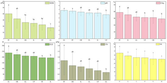 To verify the influence of land use patterns on soil aggregate stability, we investigated the relationships between land use types with the environmental factors and land use types with soil physicochemical properties found to correlate significantly with soil aggregate stability pH, Clay, SOM, TN, ELE, and Silt (Figure 8). The observed distribution of ELE is explained by the fact that higher parts of the reservoir area were dominated by forests and orchards, while lower parts were dominated by paddy fields and irrigated land. Paddy fields and forests were the land use types with the highest soil aggregate stability, followed by orchards and irrigated lands; grasslands and uplands had the lowest aggregate stability. In accordance with the previously discussed correlations, pH, Clay, SOM, and TN were highest in paddy fields and forests also had high SOM values. The lowest values of TN, SOM, and pH occurred in uplands, and grasslands also had low SOM and TN values. This shows that land use type significantly affects the soil elements and leads to differences in the stability of soil aggregates. It is worth noting that the large error in the data may be due to the sample size setting and the measurement accuracy, which needs to be regarded in the future study (Figure 8).