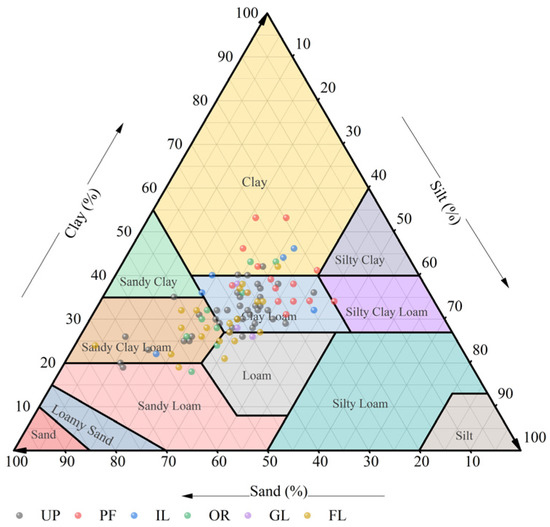 Soil texture distribution is shown in Figure 9, revealing that clay is predominant in paddy fields where soil aggregates were more stable. Sandy clay loam is also one of the main soil types, and the soil type with worse aggregate stability than clay is dominated by dry land and orchards, which is consistent with our conclusion.