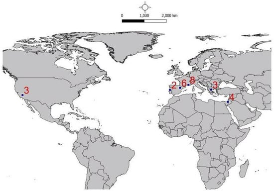 The Mediterranean-climate regions (MCRs) for which the studies met the identified search criteria were represented by the Mediterranean Basin and the State of California in North America. In particular, these studies were found in six countries, namely France, Israel, Spain, Greece, Portugal, and the United States (Figure 1) and they refer to twenty sites in total.