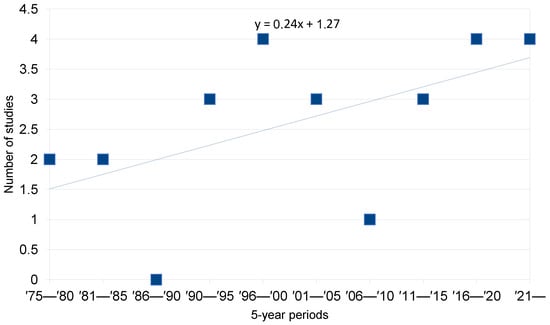The evolution of the number of studies conducted for the above purposes in a 5-year time step is shown in Figure 2. The linear rate of change in the number of studies is +24%, representing the increasing interest of the scientific community in such studies. The first published work was that of Poissonet et al. [38], related to a clearing + simulated grazing vs. controlled burning experiment in Herault, France. The second one was by Green et al. [45] in California, related to the utilization of shrubs by goats as a management tool to halt the regeneration of vegetation in fuel breaks.