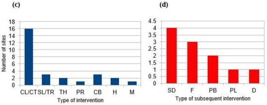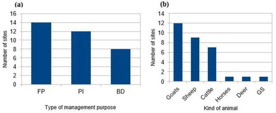 The management purposes, for which the effectiveness of interventions coupled with grazing was studied, are presented in Figure 3a. All studies were considered to deal with interventions aimed at optimal effectiveness in at least one of the three following issues: fire prevention (FP), the improvement of pastures (PI), and the achievement of a diversified botanical structure (BD) for restoration purposes. Fire prevention and pasture improvement were referenced in the majority of the sites, at 70% and 60%, respectively, while biodiversity was referenced in 40%. The kinds of animals grazing at each site are presented in Figure 3b, with goats being the main grazer (60%), followed by sheep (45%), and cattle (35%). Horses, deer, and grazing simulation (GS) were used in only one site each (5%). In the deer grazing study, other wild herbivores also grazed the area, but some enclosures that were intentionally established to evaluate the lack of grazing prevented deer access [46]. The types of management treatments that preceded grazing are presented in Figure 3c. In the large majority of sites (80%), land clearing (CL) or cutting above the base of the plants (CT) was the only biomass reduction intervention, or was one among other treatments, while in a smaller number of sites other treatments were included, namely slashing (SL), trimming (TR), controlled burning (CB), thinning (TH), pruning (PR), herbicide (H) application, and mastication (M). Subsequent interventions without biomass reduction, namely seeding (SD), fertilizing (F), pile burning (PB), ploughing (PL), herbicide (H) application and draining (D) were applied in 36% of the sites (Figure 3d).