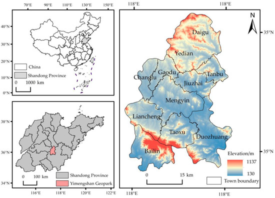 The Yimengshan Geopark (YG) is in Linyi City, Shandong province, and ranges from 35°26′ N to 36°01′ N and from 117°43′ E to 118°14′ E (Figure 1). It involves seven counties—Mengyin, Feixian, Pingyi, Yishui, Yinan, Junan, and Linshu. There are hundreds of scenic spots including Mengshan Park, Diamond Park, Daigu Park, Menglianggu Park, and Yunmenghu Park. It is a comprehensive geological park with multiple geological heritage resources, with a total area of 1804.76 km2. The YG is in a low mountain hillside area, surrounded by three mountains on the west, north, and south sides, with high terrain in the south and north and low terrain in the middle. The Yimeng Mountain region belongs to the continental monsoon climate of the East Asian warm temperate zone, with four distinct seasons. The average annual temperature ranges from 12 to 13.5 °C, and the average annual precipitation is 823.8 mm. The geological park is situated in an area rich in rivers and water resources. In 2022, the regional GDP was CNY 233.78 billion, the per capita GDP was CNY 42,528.65, and the population of permanent residents was 0.5497 million. With outstanding ecological service functions, this area is dominated by ecological space and serves as an important ecological barrier in southern Shandong province as well as an important water source protection area in the northern part of the Huai River Basin.