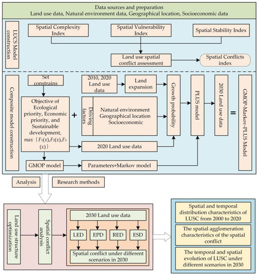 Based on the spatiotemporal evolution of LUSC in the YG, this study constructed a grey multi-objective optimization (GMOP)–Markov–PLUS coupling model to optimize land-use structures under four scenarios in 2030 and to calculate and analyze LUSC. The research framework is shown in Figure 2.
