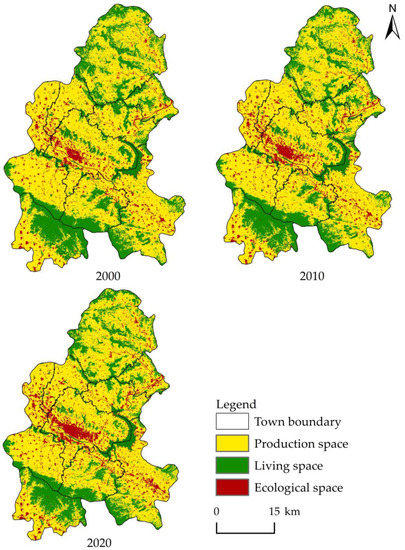 Land has multifunctional properties. Based on previous research and actual situations [47], all land-use classification types were divided into production space, living space, and ecological space to establish a new land-use classification system to reflect the land-use spatiotemporal changes and spatial conflict status in YG (Table 2, Figure 3).