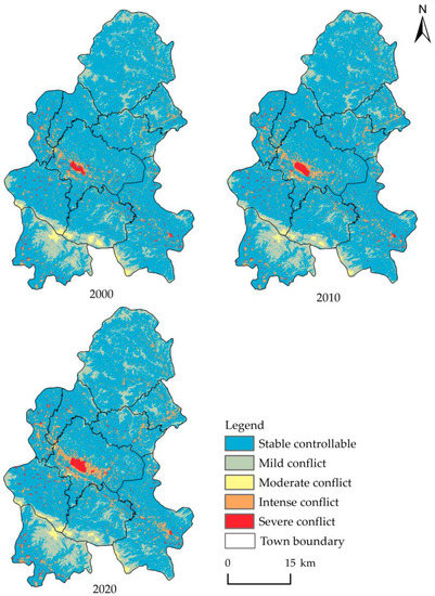 - From 2000 to 2020, the LUSC in the YG was mainly stable controllable or had mild conflict, with visible changes in the area at all grades. The central urban areas of Mengyin County and low-lying areas, such as southern Bailin Town, have seen the greatest increase in areas of severe conflict. The areas of intense conflict, which are second in scale, are distributed around construction land in various urban areas, adjacent to the severe conflict areas, and along both sides of the river.