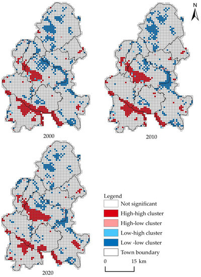 where LISAi is the local spatial autocorrelation statistic of spatial unit i; n is the number of spatial units in the study area; xi and xj denote the LUSC intensity values of units i and j, respectively; denotes the average value of LUSC intensity; and Wij is the spatial weight matrix. The value of Moran’s I ranges from −1 to 1, with I > 0 indicating a positive spatial autocorrelation and I < 0 indicating a negative spatial autocorrelation. An LISAi value greater than 0 means that the similar higher or lower values are clustered around the target grid, and the value of LISAi being less than 0 indicates that a grid has high (low) value with low-value (high-value) neighbors.