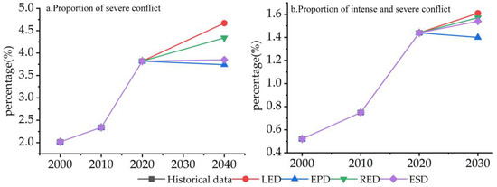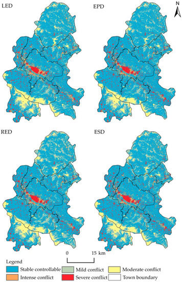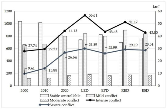 From 2000 to 2020, the spatial conflict area of YG underwent remarkable regional expansion. The area of intense conflict increased from 27.74 km2 in 2000 to 44.13 km2 in 2020, and the area of severe conflict increased from 9.61 km2 to 26.64 km2, indicating that the human–land conflict in YG has intensified over the last 20 years. It is urgent to coordinate and balance the LUSC. Simulation results show that the LED continues the study area’s historical growth and change trajectory, causing unorganized expansion of the areas of severe and intense conflict. The simulation results of the RED scenario are slightly better than those of the LED, but the trend of intense and severe conflict zone expansion remains unchanged. In the EPD and ESD, the evolution curves of both intense and severe conflict areas show a downward trend, indicating that the land-use conflict situation has improved.