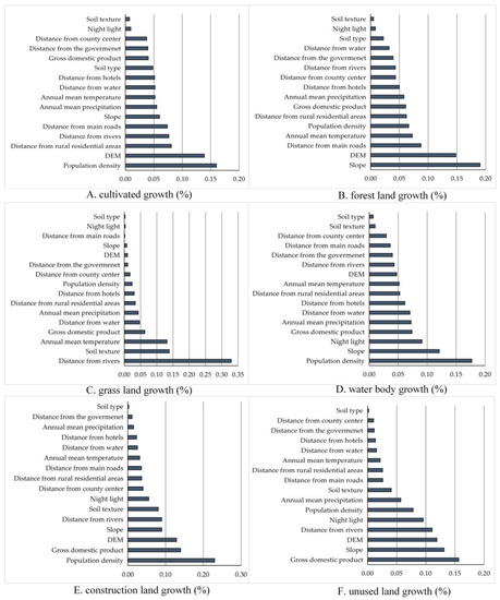 Driving factors’ importance rankings of six land-use types used in the scenario simulations.