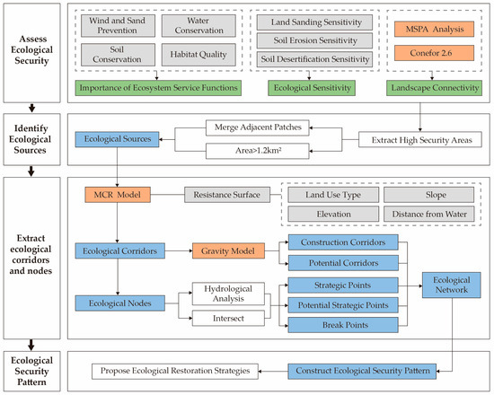 - Li, Q.; Zhou, Y.; Yi, S.Q. An integrated approach to constructing ecological security patterns and identifying ecological restoration and protection areas: A case study of Jingmen, China. Ecol. Indic. 2022, 137, 13. [Google Scholar] [CrossRef]