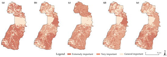 Results of ecosystem service importance assessment. (a): Wind and sand prevention; (b): Water conservation; (c): Soil conservation; (d): Habitat quality; (e): Ecosystem service importance.