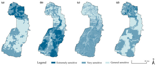 Results of ecological sensitivity assessment. (a): Land desertification; (b): Soil erosion; (c): Soil rocky desertification; (d): Ecological sensitivity assessment.