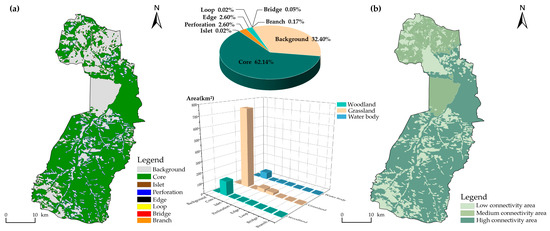 Results of landscape connectivity assessment. (a): MSPA landscape elements; (b): Landscape connectivity.