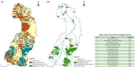 Ecological security assessment result and ecological source distribution. (a): Ecological security evaluation; (b): Ecological source distribution.