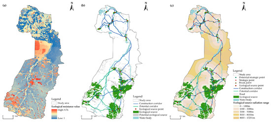 Ecological corridors and nodes distribution. (a): Resistance surface; (b): Ecological corridor distribution; (c): Ecological network.