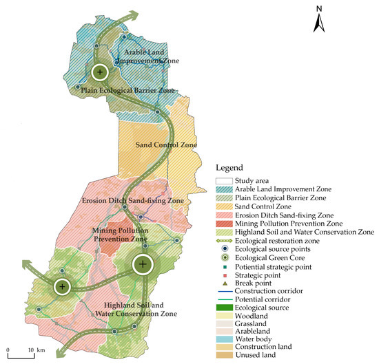 Based on the identified ecological sources, corridors, and nodes, combined with the current land use situation, ecological security assessment distribution, and other attributes, the ecological security pattern of “two belts, three cores, six zones, multiple corridors and multiple nodes” was proposed (Figure 8), providing a reference for the ecological environment governance of the Xiliu Ditch Basin. The two belts included the Northern Wangmao–Bashtu Gully Ecological Construction Belt and the Laochang Bay–Bashtu Gully Ecological Replenishment Belt and had a relatively concentrated corridor distribution. The three cores included the Bashtu Gully Ecological Core, Laochang Bay Ecological Core, and Northern Wangmao Ecological Core, which radiate outward and connect multiple ecological sources. The six zones included the plain ecological barrier zone, arable land improvement zone, sand control zone, erosion ditch sand-fixing zone, mining pollution prevention zone, and highland soil and water conservation zone. The constructed ecological corridors and nodes ensure the continuity of the energy cycle and species migration and ensure the stability of regional ecological security.