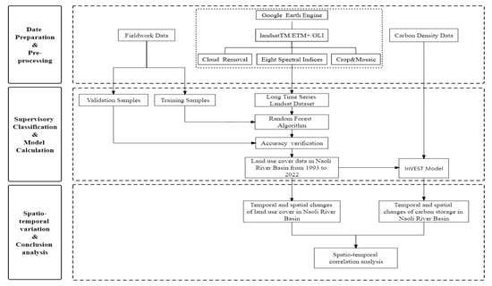 In this study, based on the GEE platform, Landsat remote sensing image data was utilized and the random forest algorithm was employed to classify land use in the NLR Basin and analyze its spatial and temporal evolution. The obtained land use data were used with the InVEST model to analyze the spatial and temporal changes in carbon storage in the basin.